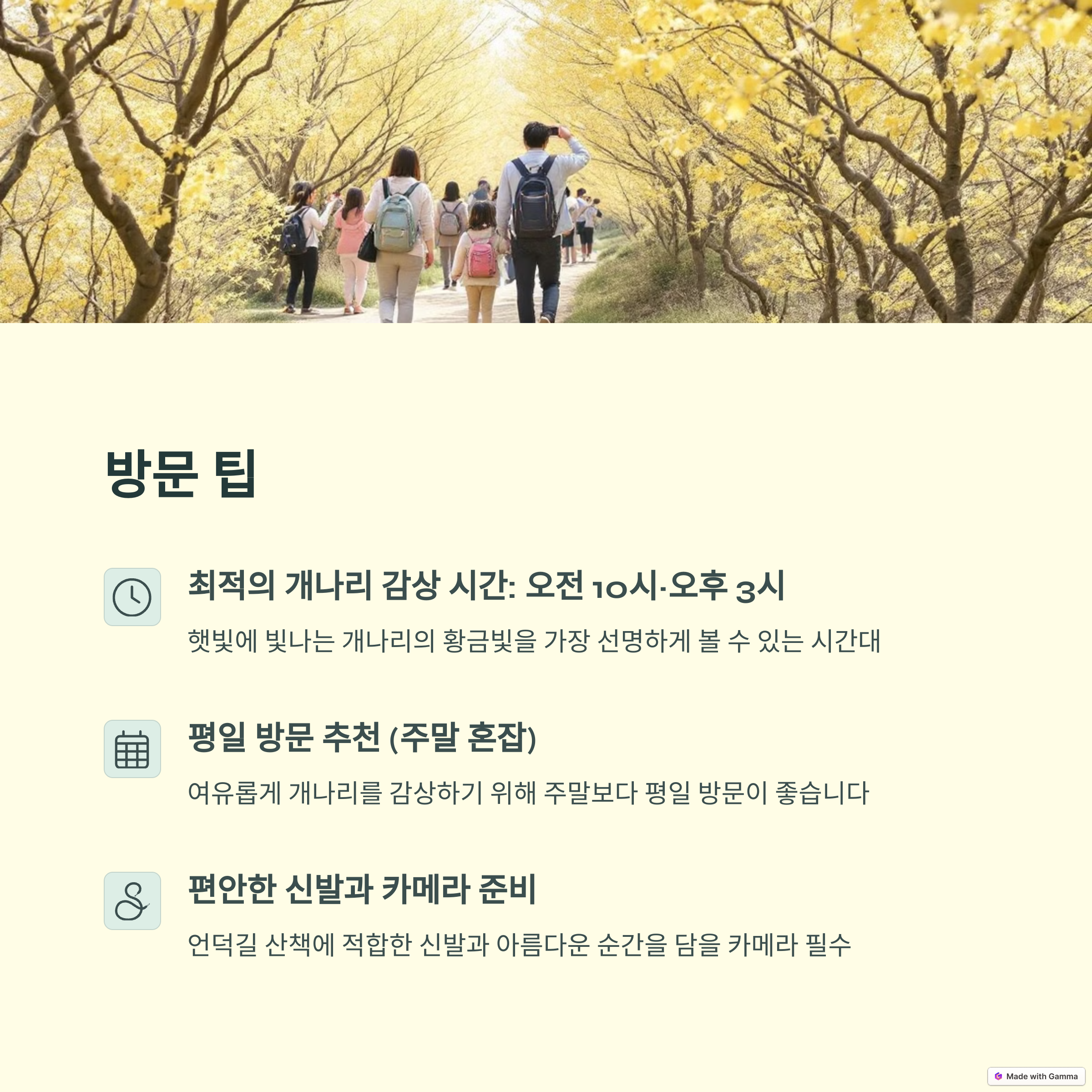 개나리 절정 시기에는 인파가 몰리기 때문에 평일 오전 시간대 방문을 추천드려요. 또한, 팔각정 야경은 일몰 30분 전에 도착하면 가장 멋진 풍경을 볼 수 있답니다.