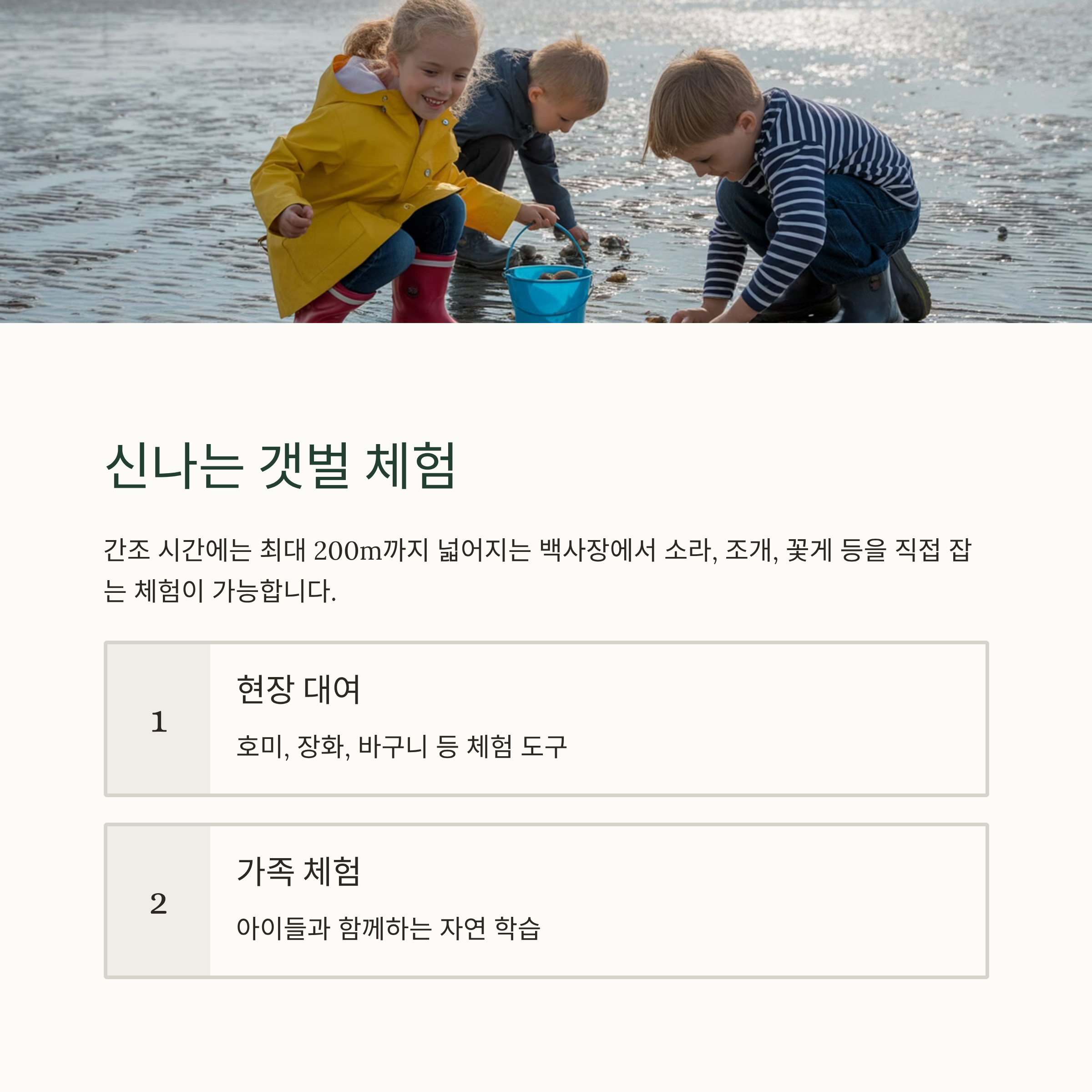 소라, 조개, 꽃게 등을 직접 잡는 갯벌 체험이 가능합니다.