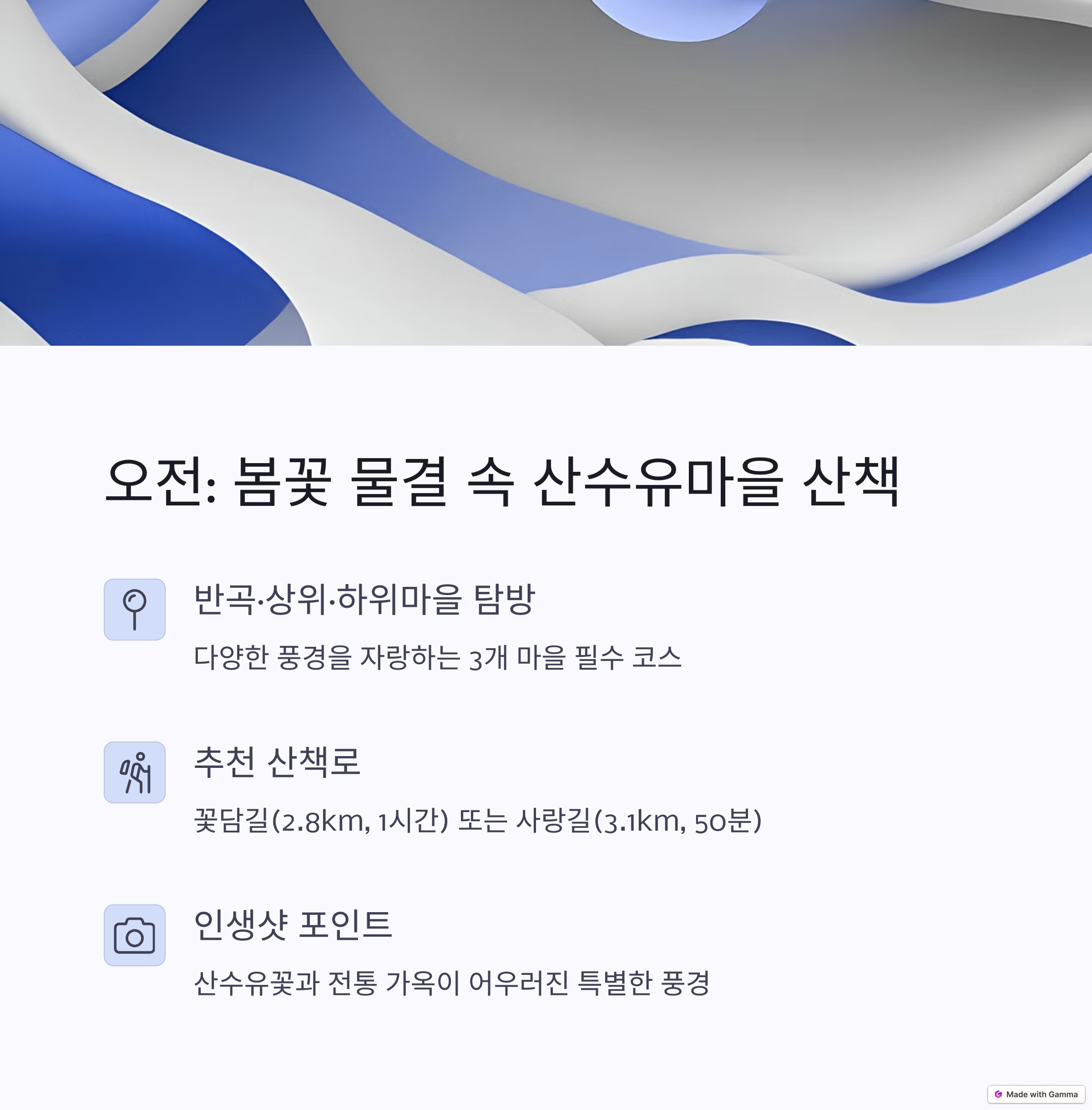 | 반곡, 상위마을에서 산수유꽃 절경 감상 | 전통 한옥과 정원이 어우러진 촬영지 | 오전 방문, 셔틀버스 이용, 렌터카 추천 |
