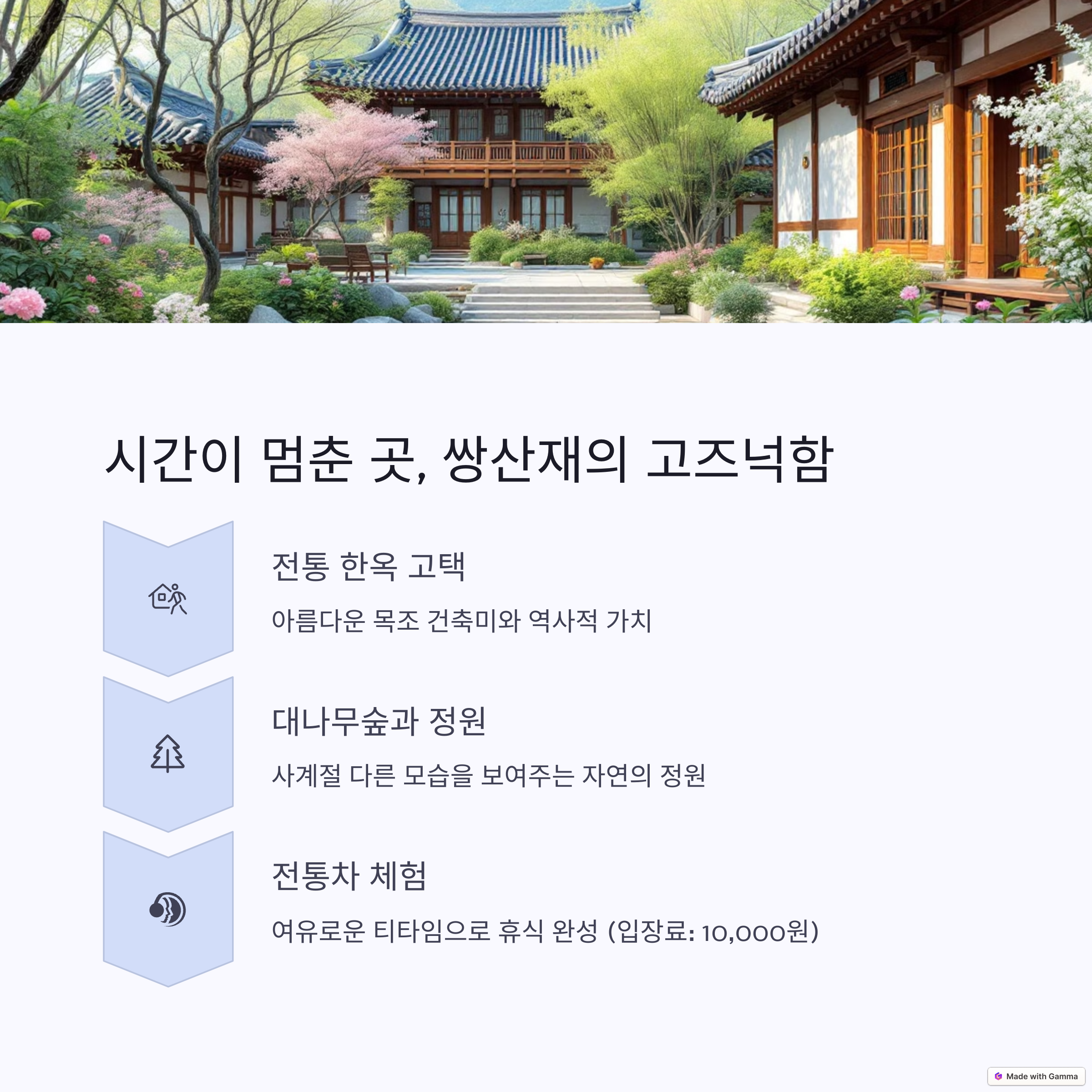 오후에는 쌍산재로 이동해 조용한 고택 산책을 즐길 수 있습니다. 이곳은 윤스테이 촬영지로 유명하며, 사랑채와 안채 등 전통 한옥이 고스란히 보존되어 있어 시간이 멈춘 듯한 분위기를 자아냅니다. 정원에는 대나무숲과 수목이 어우러져 있고, 당몰샘이라 불리는 명소에서는 시원한 샘물을 맛볼 수 있답니다. 관람은 중학생 이상만 가능하며, 음식물 반입 및 반려동물 출입은 금지되어 있으니 방문 전 참고하세요.
