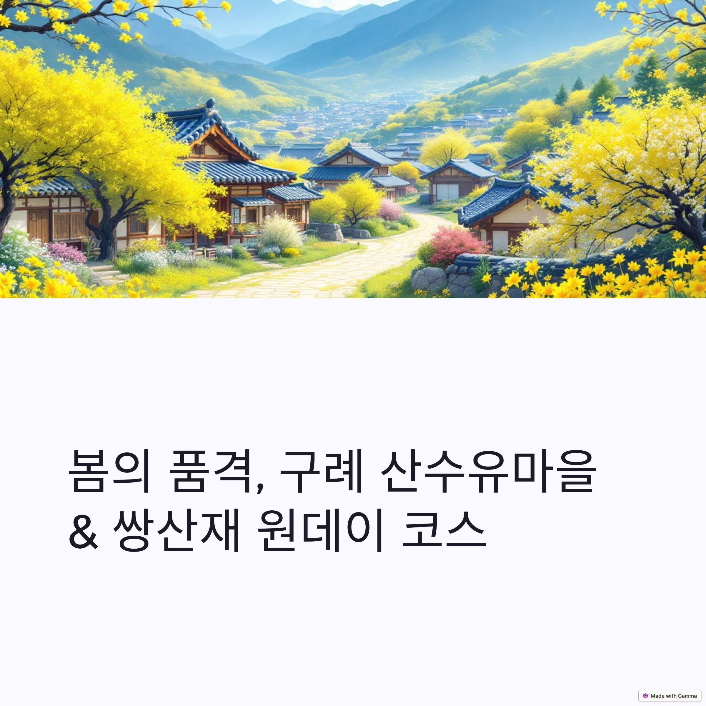 봄이 오면 떠오르는 대표 여행지 중 하나는 단연 전남 구례입니다. 특히 노란 산수유꽃이 흐드러지게 피는 3월 중순부터 하순까지는 수많은 여행자들의 발길이 이어지곤 하지요. 이때 가장 인기 있는 코스는 산수유마을과 쌍산재를 함께 둘러보는 일정입니다. 이 글에서는 그 두 곳을 어떻게 효과적으로 하루 안에 즐길 수 있을지, 방문 시간과 이동 동선, 그리고 소소하지만 중요한 팁까지 친절히 안내해 드릴게요. 계절의 변화가 선물하는 따뜻한 햇살과 꽃향기, 전통 고택의 고즈넉함이 어우러지는 구례 여행의 정석, 지금부터 함께 계획해보세요. 본문을 따라 차근차근 읽으시면, 어느덧 여러분만의 완벽한 여행 일정이 그려질 것입니다.