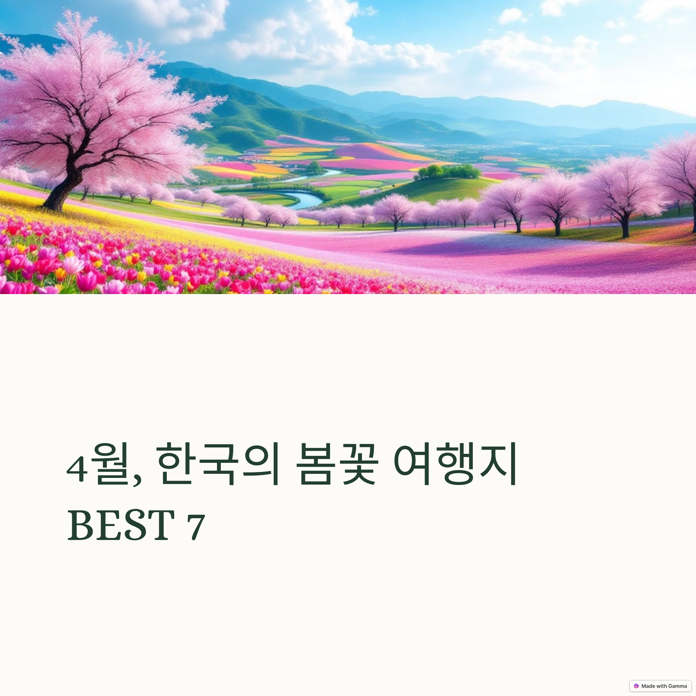 따뜻한 햇살이 내리쬐는 4월, 본격적인 봄꽃 여행의 계절이 찾아왔습니다. 서울부터 제주까지, 전국 방방곡곡에서 활짝 핀 꽃들이 여행자들의 눈과 마음을 사로잡고 있습니다. 특히 이번 달은 벚꽃, 유채꽃, 매화, 튤립, 진달래 등 다양한 봄꽃들이 절정을 맞이하는 시기이기에 짧은 주말 여행 또는 연차를 활용한 당일치기 일정으로 봄의 절경을 만끽하기에 딱 좋은 타이밍입니다. 본 글에서는 봄을 맞이해 꼭 가봐야 할 4월 국내 봄꽃 명소 7곳을 소개드립니다. 각 지역의 특징, 방문 시기, 즐길 거리 등을 알차게 담았으니, 일정을 고민 중이시라면 이 리스트를 참고해 완벽한 여행을 계획해보세요.