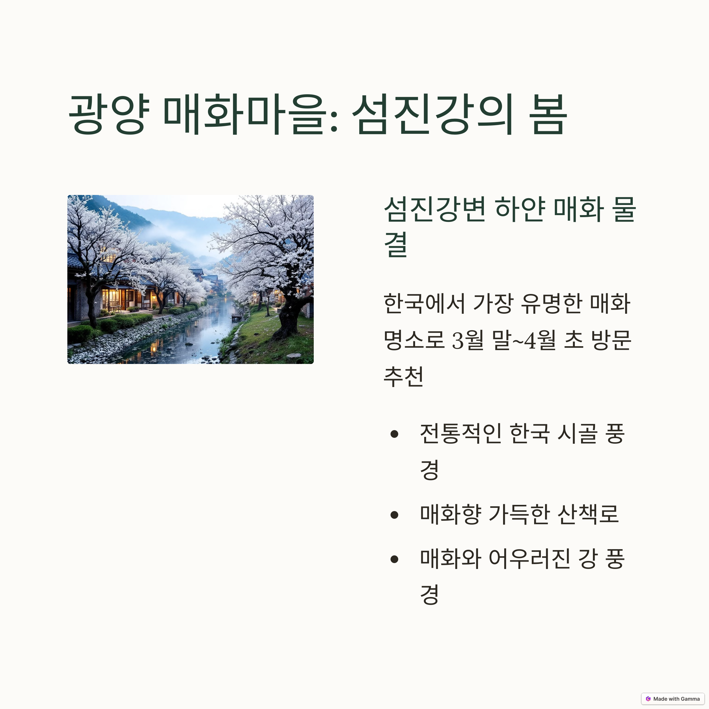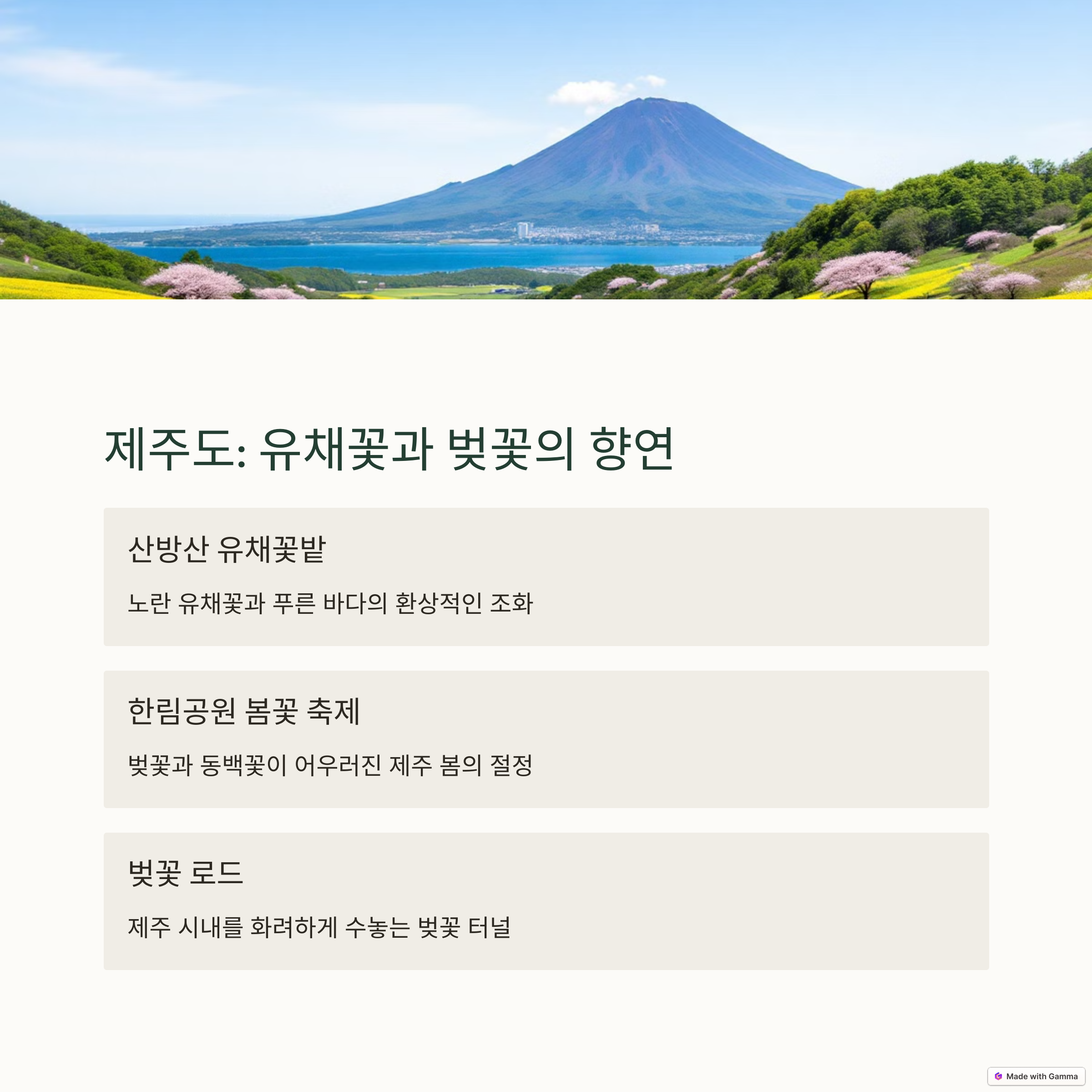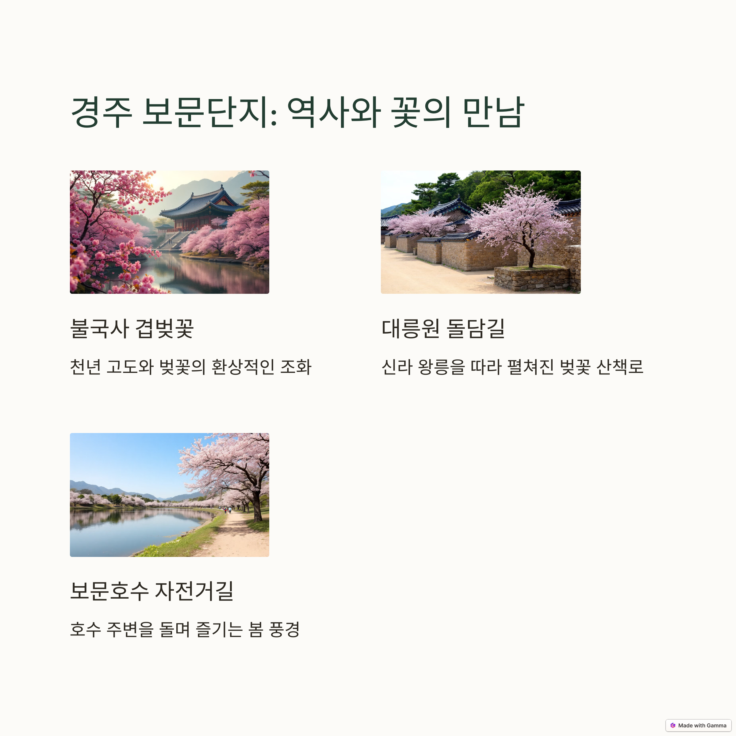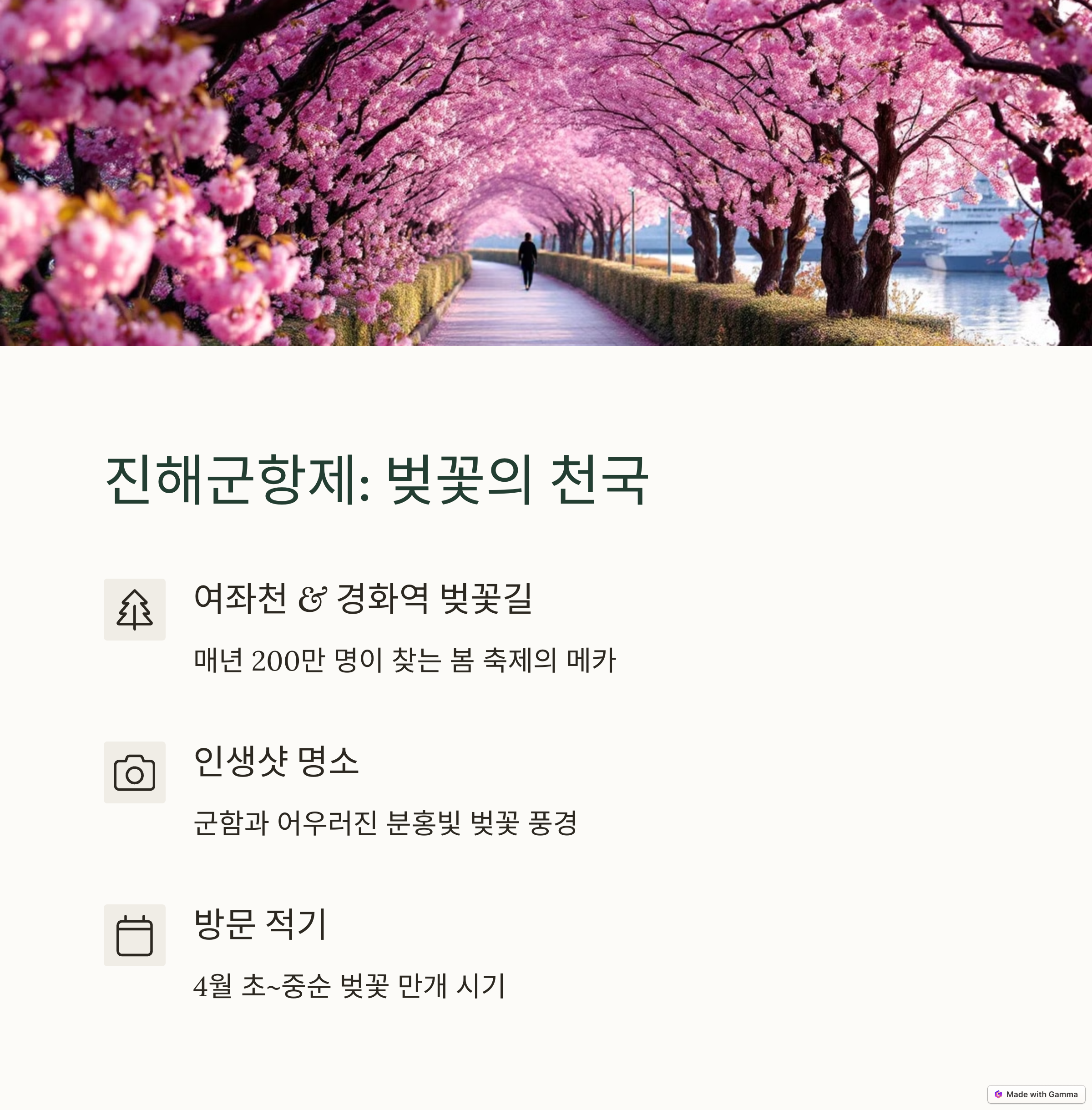 | 여좌천, 경화역 등 벚꽃 포토존 명소 | 불국사, 대릉원 야경 벚꽃 라이트쇼 | 산방산, 용머리해안 유채꽃 절정 시기 |
