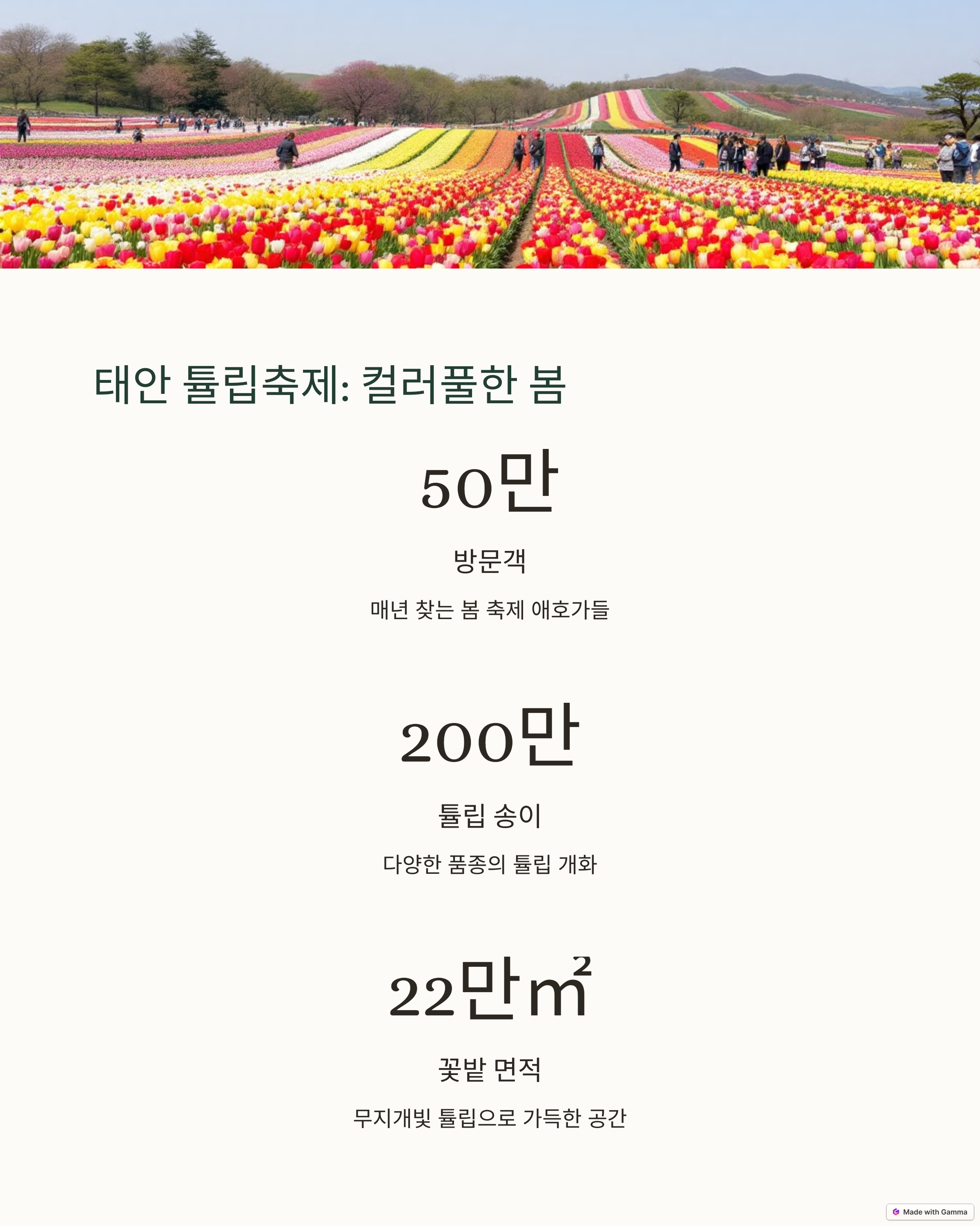 남도 지역으로 내려가면 제주의 유채꽃과 광양 매화마을이 봄의 정취를 더해줍니다. 제주 유채밭은 산방산과 용머리해안을 배경으로 사진 명소로 사랑받으며, 광양은 섬진강을 따라 매화가 흐드러지게 피어납니다. 봄꽃의 황금 조화를 원한다면 태안 튤립축제도 빼놓을 수 없습니다. 형형색색의 튤립이 봄날 정원처럼 펼쳐지는 그 모습은 동화 속 한 장면을 연상케 합니다.