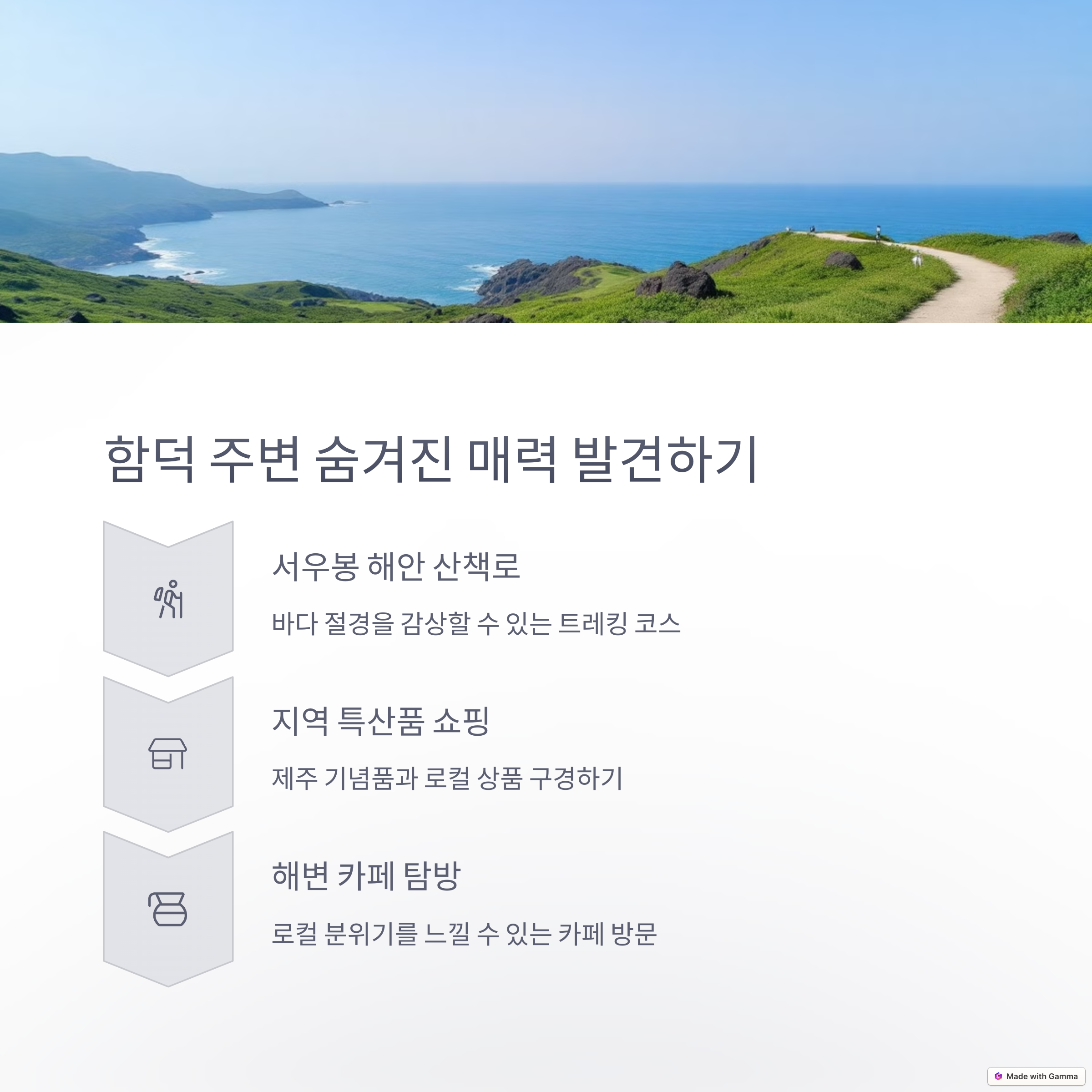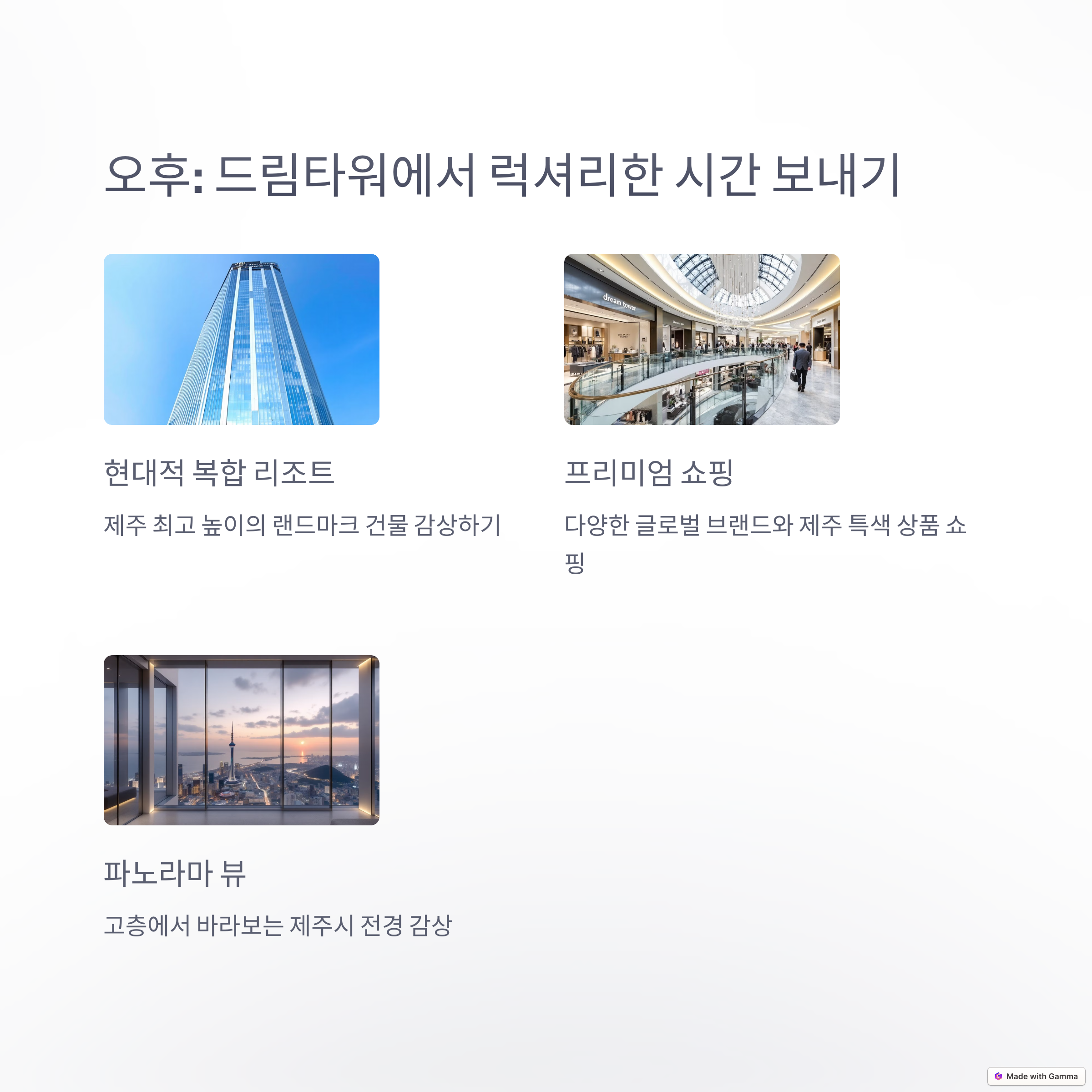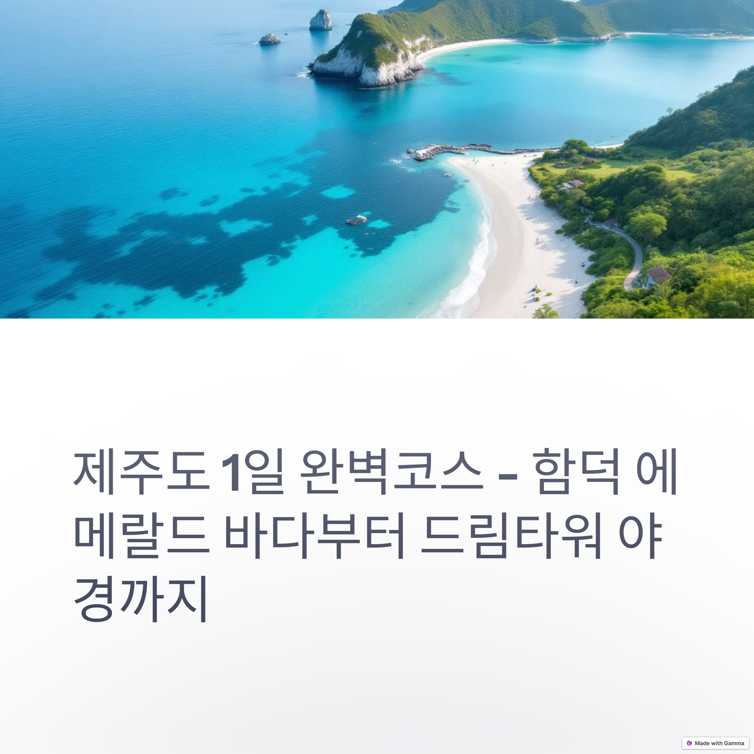 제주여행에서 자연과 도시의 매력을 모두 느끼고 싶다면, 함덕해수욕장부터 드림타워까지의 코스는 그 어떤 여행자에게도 만족스러운 일정을 선사합니다. 여유로운 바다 산책, 현지 로컬 맛집 체험, 그리고 도심 속 세련된 저녁까지. 하루 안에 다양한 감성을 담아내는 이 코스로 제주만의 매력을 만끽해보세요.