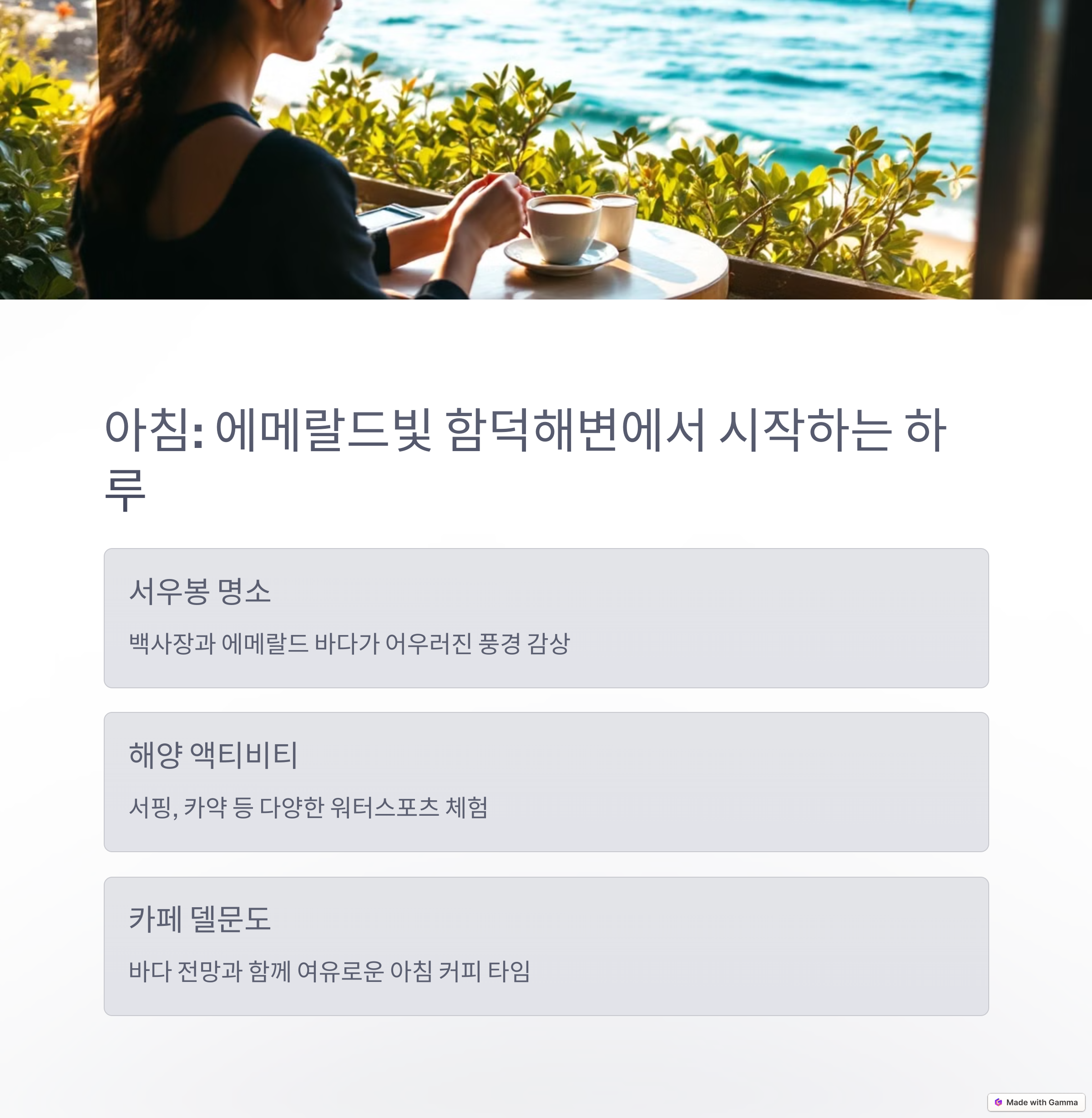 여행 테마 | 바다 산책, 전망 명소, 로컬 맛집과 고급 레스토랑 투어 |