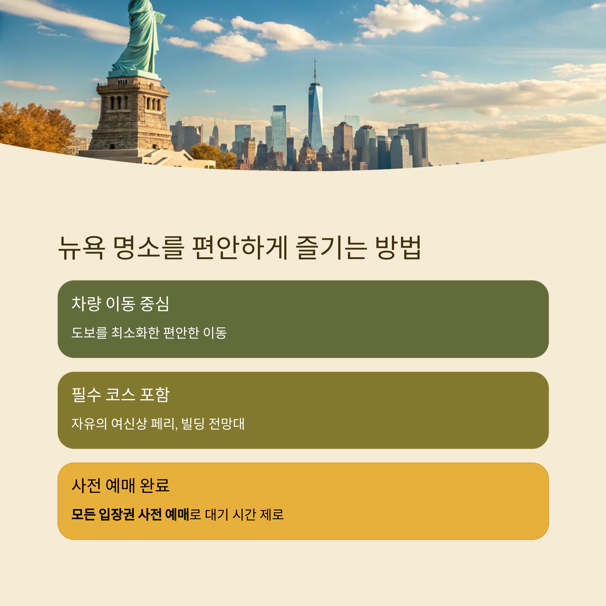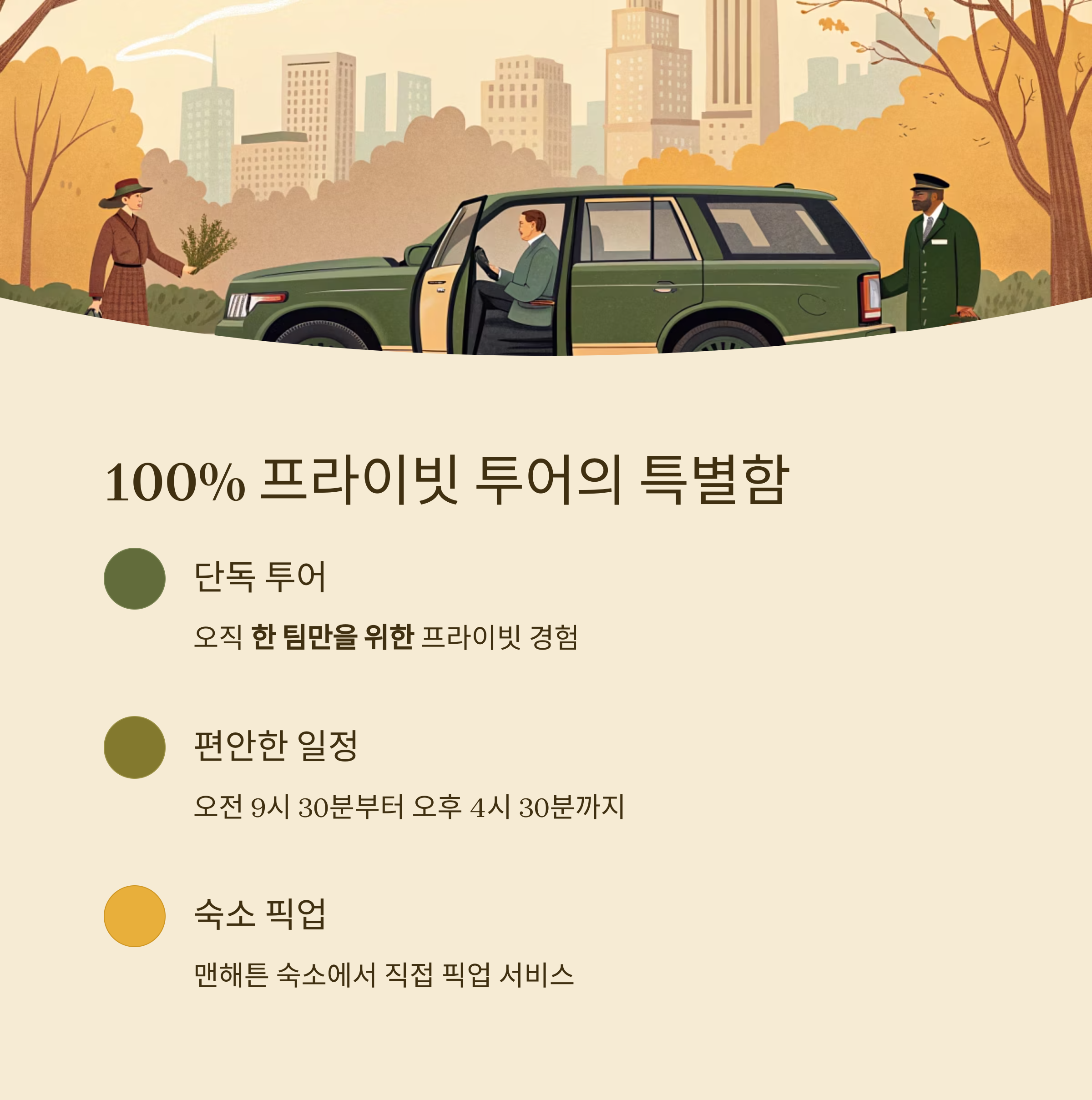 뉴욕 시티 단독 코스는 도보를 최소화한 차량 이동 중심입니다.
