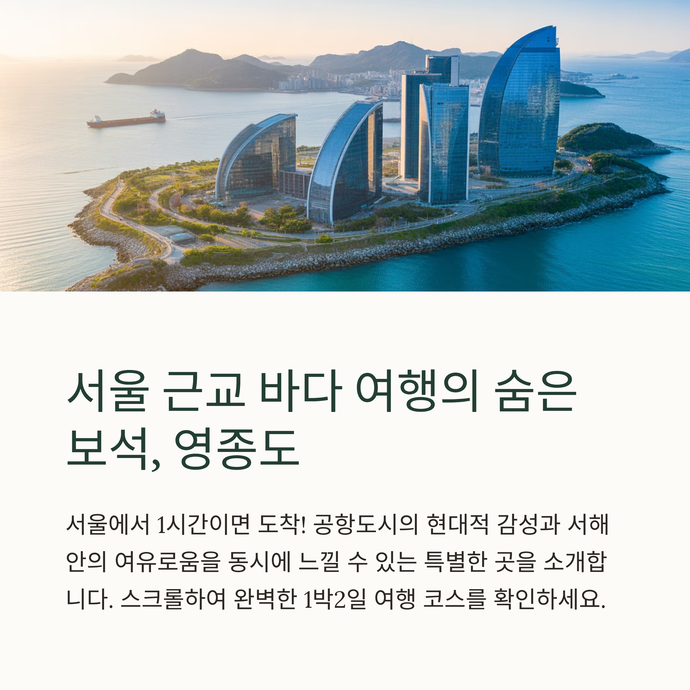 서울 근교에서 바다와 감성을 모두 즐기는 방법은?영종도는 서울에서 1시간 남짓이면 도착할 수 있는 섬 여행지로, 공항도시의 현대적 감성과 서해안의 여유로움을 동시에 느낄 수 있는 특별한 곳입니다. 바다 전망 산책로, 감성 카페, 해산물 맛집, 레저 액티비티, 숙박까지 모든 요소가 완비되어 있어 1박2일 여행에 최적화되어 있습니다. 지금부터 2025년 여름을 기준으로 완성된 여행 루트를 소개해 드리겠습니다.서울에서의 출발, 영종도로 향하는 바다 드라이브서울에서 영종도로 향하는 길은 이미 여행의 시작입니다.인천대교 또는 영종대교를 건너며 탁 트인 바다를 따라드라이브하는 구간은 단연 최고입니다.통행료는 2025년 기준 편도 6,500~7,000원이며,지하철(공항철도)을 이용하면 교통비도 절약 가능합니다.영종씨..