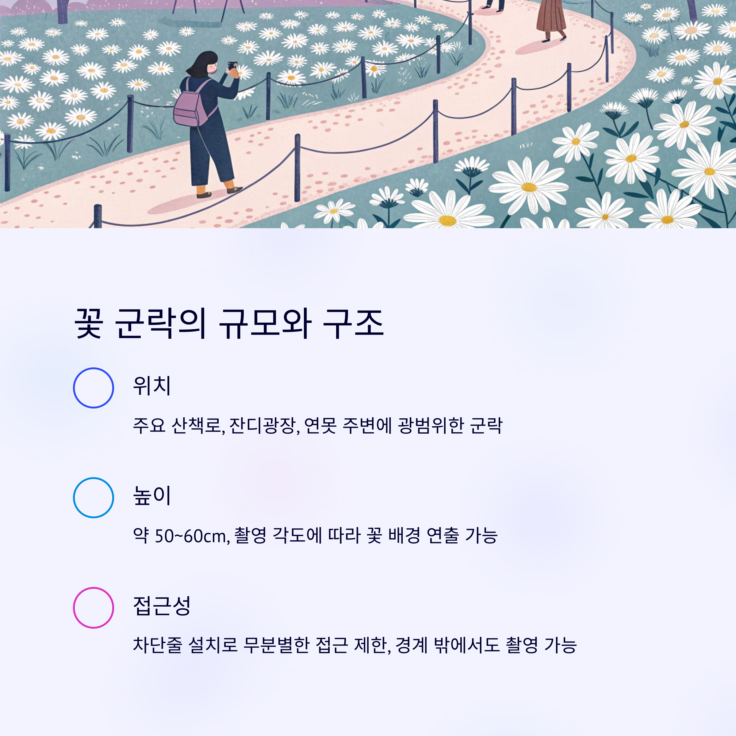포토존 | 산책로, 조각상, 다리, 연못 등 다양 | 단순 꽃밭, 포토존 제한적 |