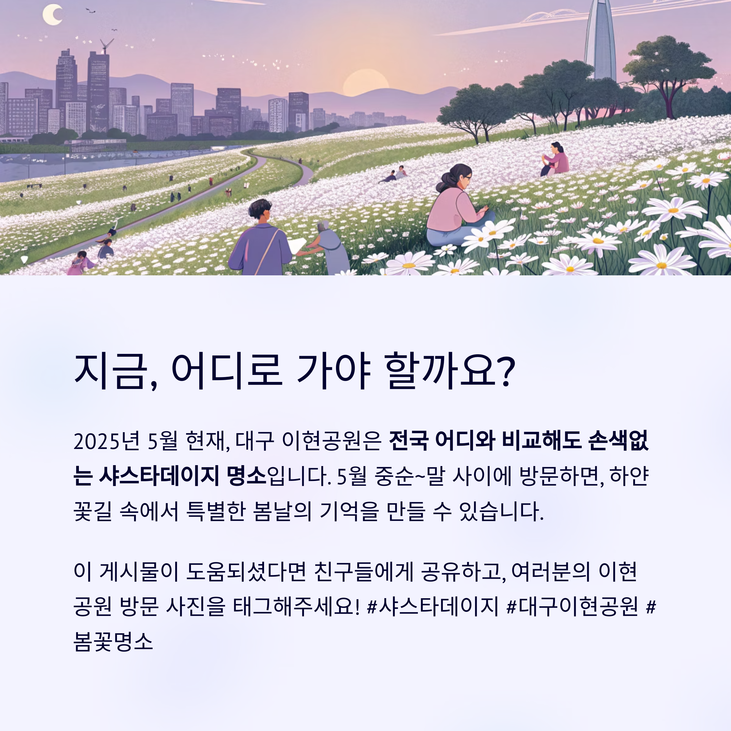 대구 이현공원은 매년 5월 중순부터 말까지 샤스타데이지가 장관을 이루는 대표적인 봄꽃 명소입니다.