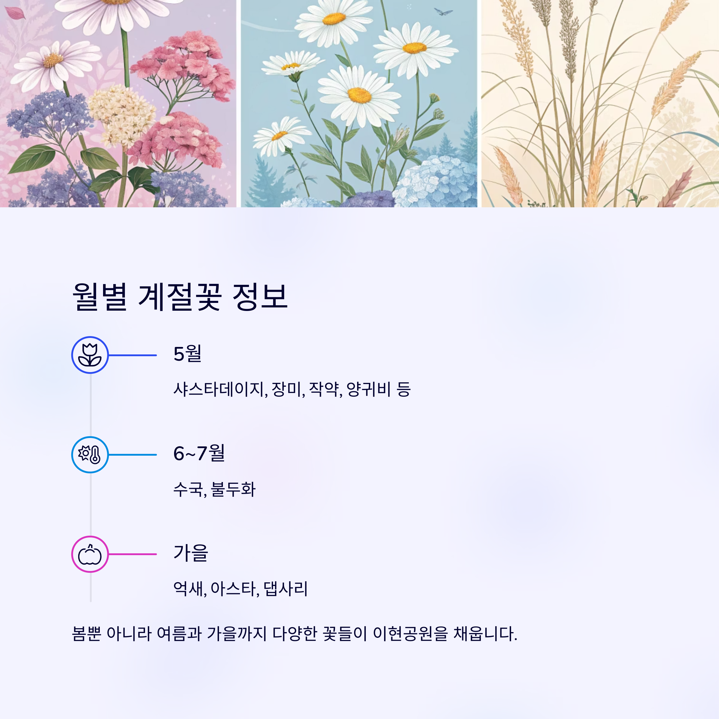 봄뿐 아니라 여름과 가을까지 다양한 꽃들이 이현공원을 채웁니다.