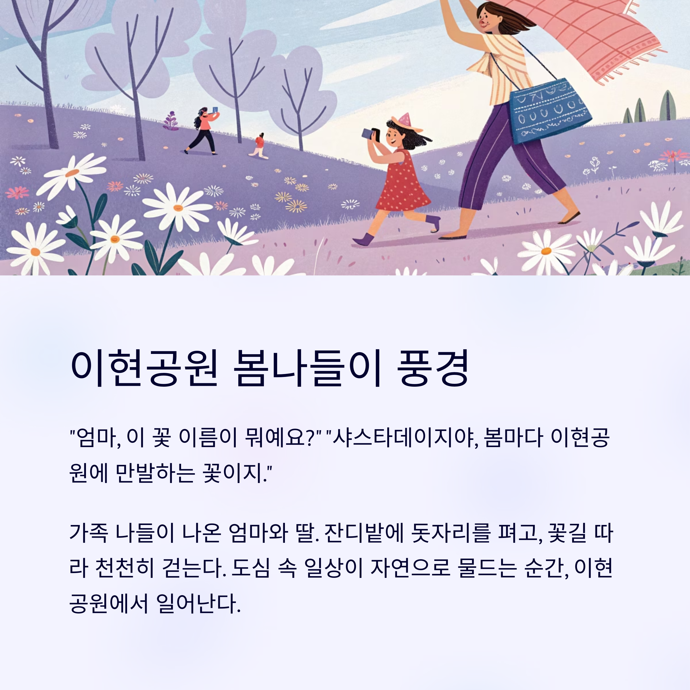가족 나들이 나온 엄마와 딸. 잔디밭에 돗자리를 펴고, 꽃길 따라 천천히 걷는다.